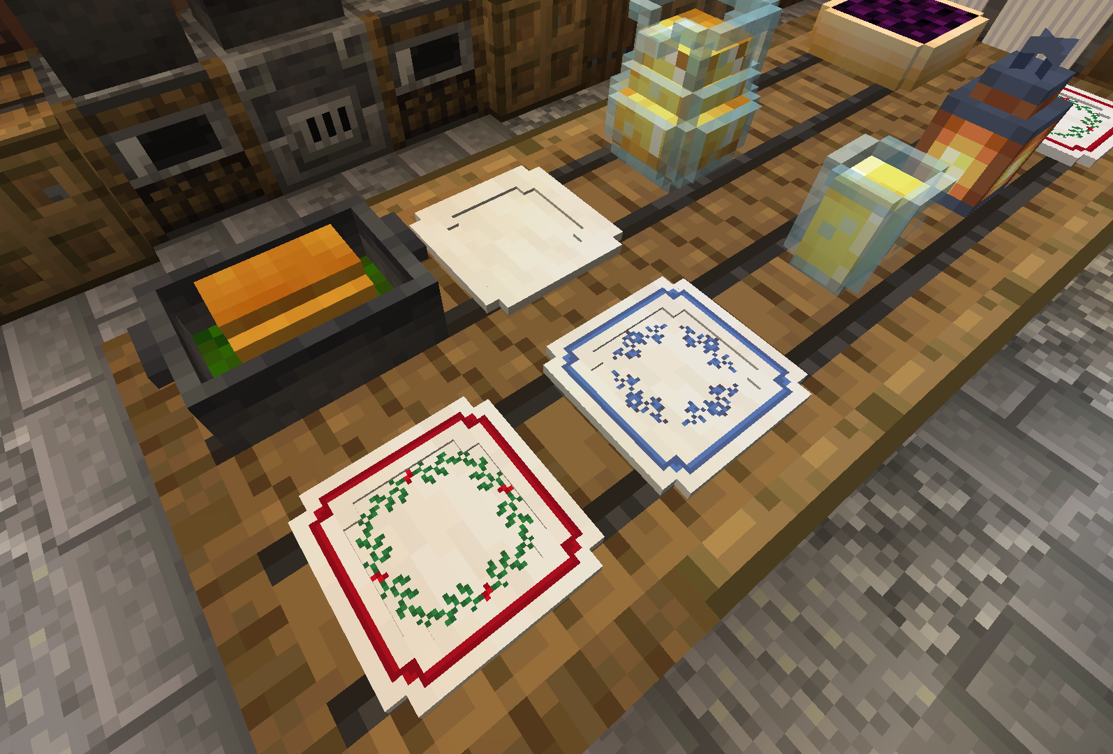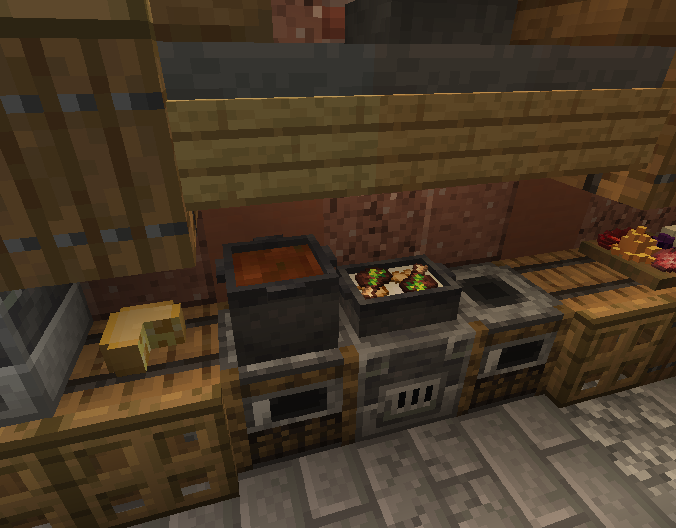 The Cheese shelf holds two cheese wheels at a time, for aging. This block is interactive, and has a GUI similar to a Furnace.