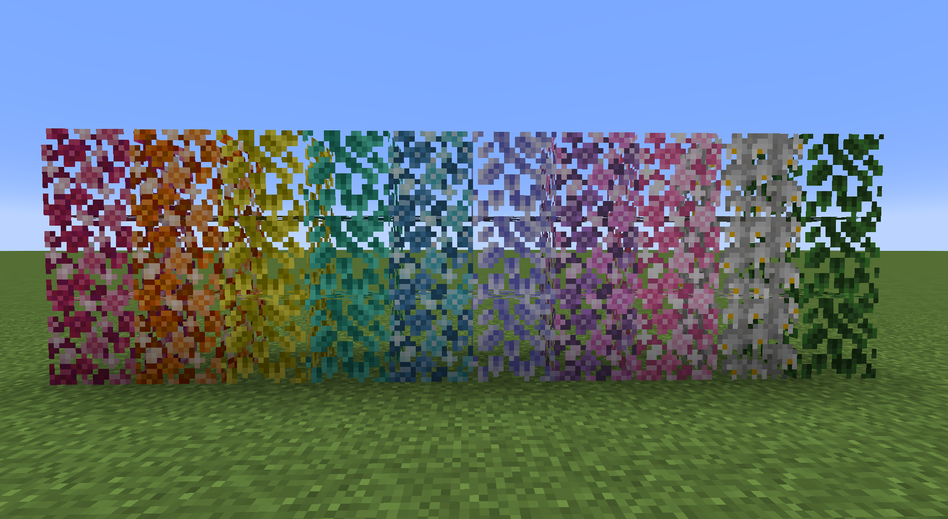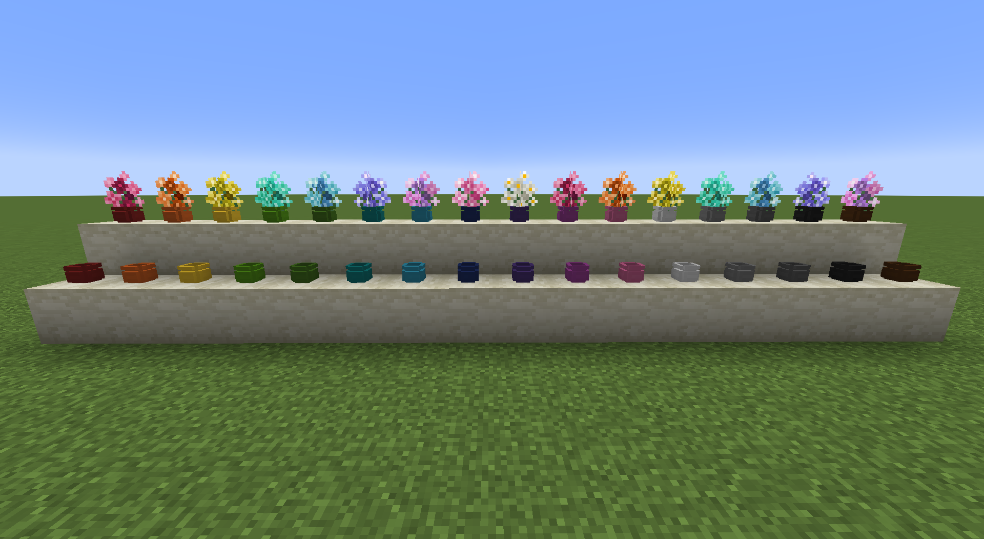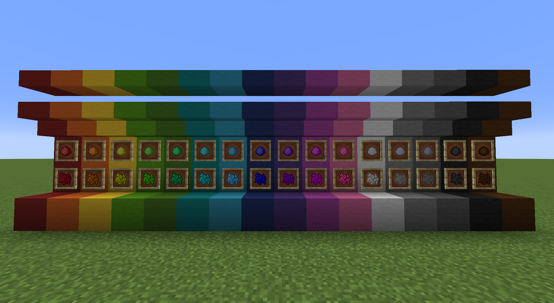 Clay Blocks are crafted by making a mix with the pigments from Ornamental Forest tree leaves, and these blocks come in all 16 Minecraft colors. There are Blocks, slabs, and stairs.