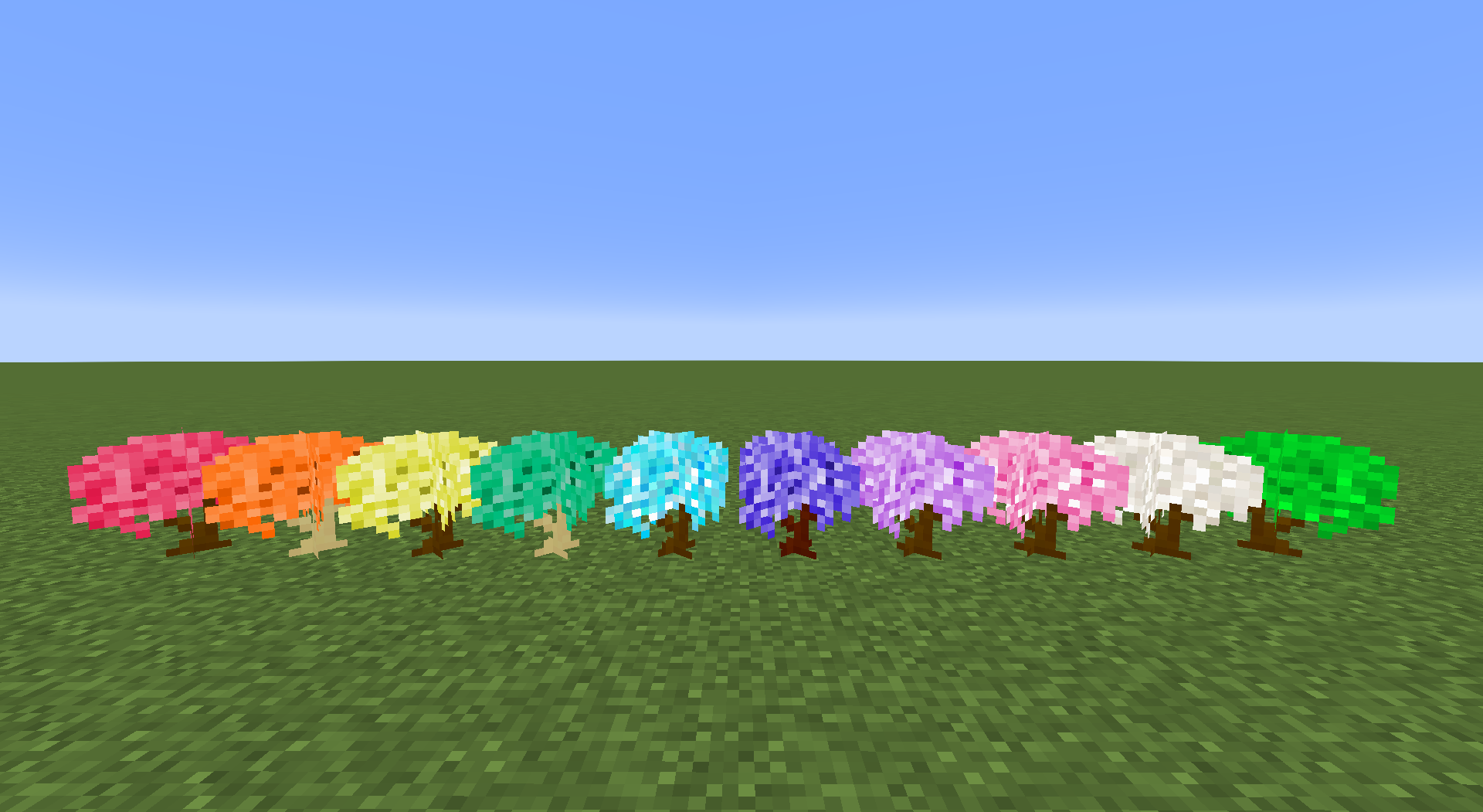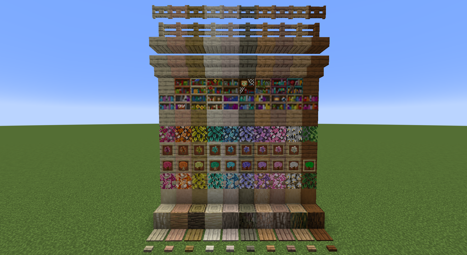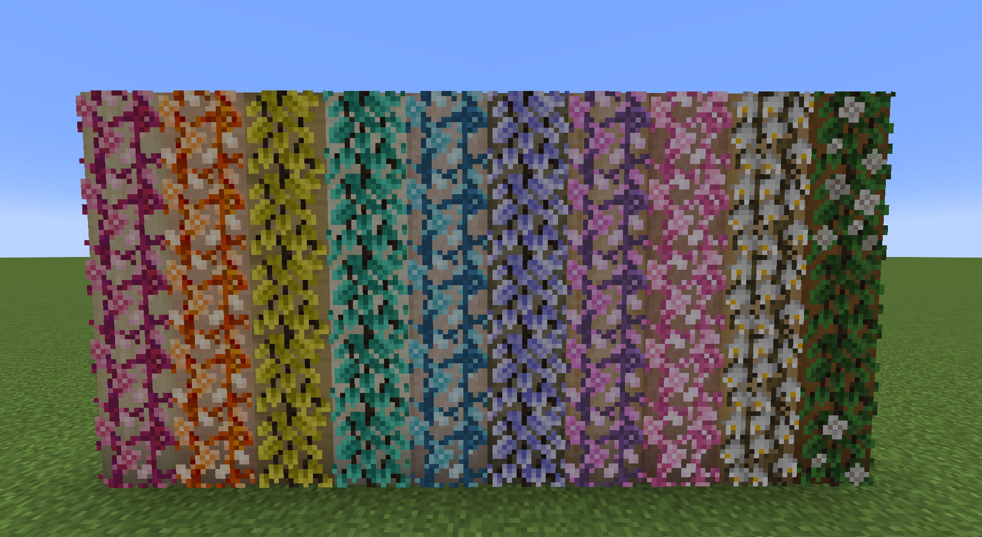 These trees can all be found growing in the Ornamental Forest. Each tree can be harvested for their woods, and subsequently crafted into all of the wood blocks: Planks, Stairs, Slabs, Pressure Plates, Buttons, Doors, Trapdoors and Bookshelves.