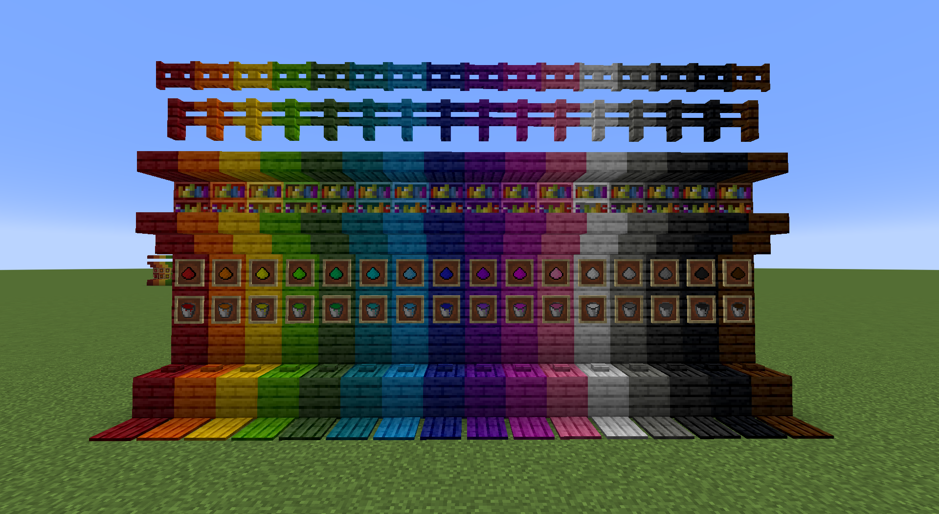 The Stained Planks come in all 16 Minecraft colors. They can be used to craft all of the wood blocks: Planks, Stairs, Slabs, Pressure Plates, Buttons, Doors, Trapdoors and Bookshelves.